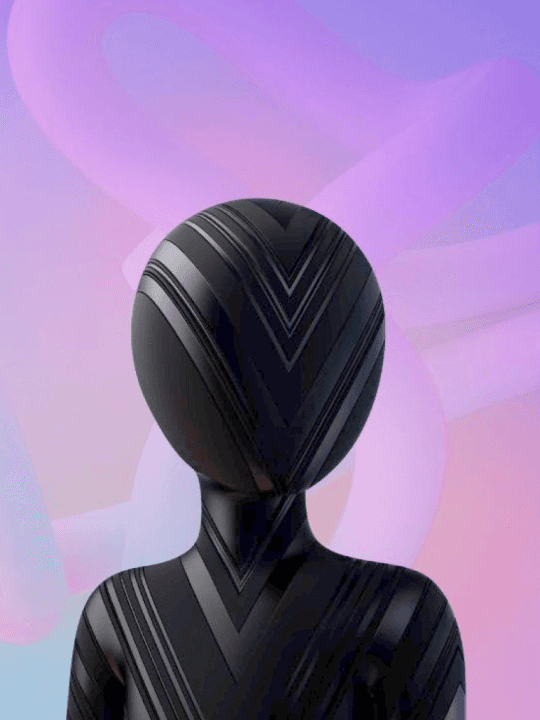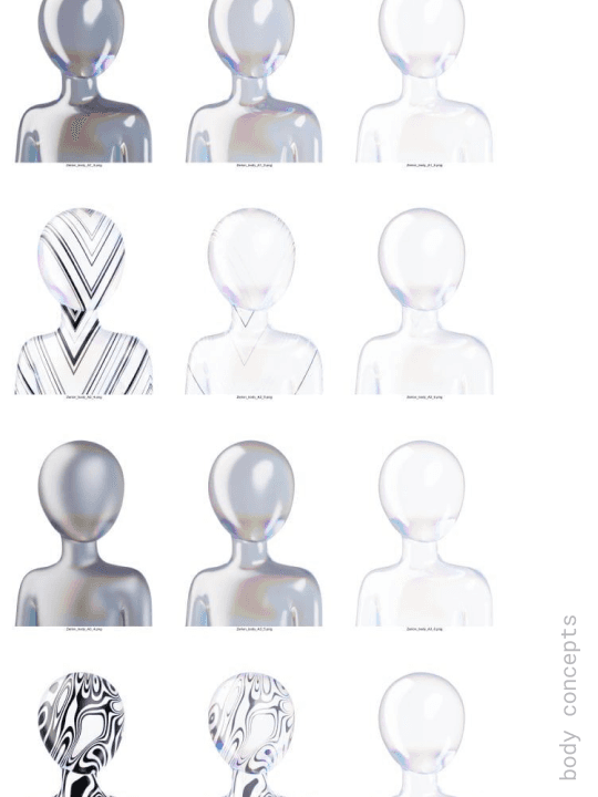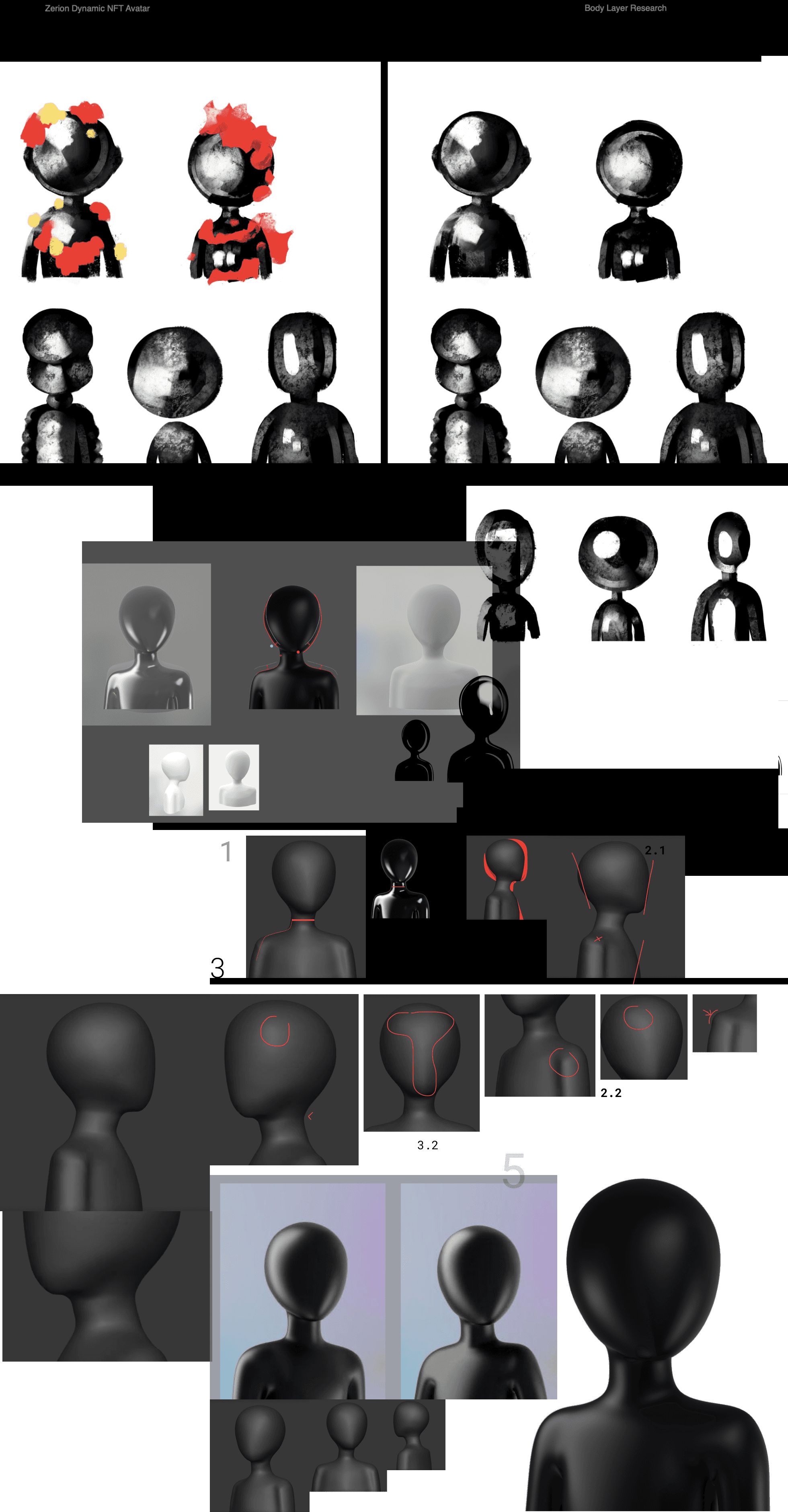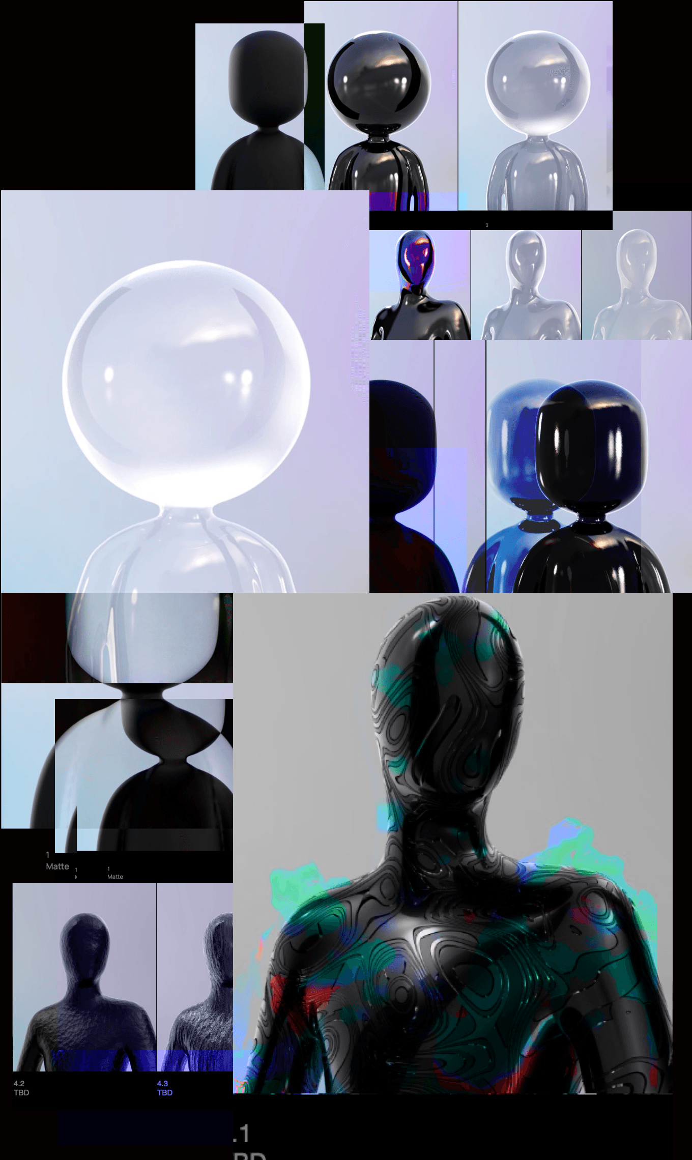 We found the final pose and shape for the body and added levels to it. Over time, the body would evolve from solid to fully transparent. The concept came from the idea of blockchain transparency.